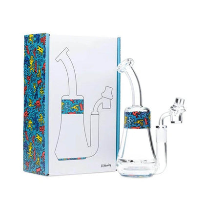Hitzeresistente Designs werden per Hand auf das Borosilikatglas aufgetragen. Kräftige Linien und kontrastierende Farben betonen Harings lebendige Ästhetik. Das einzigartige Rig wird durch Keith Harings Signatur vollendet.